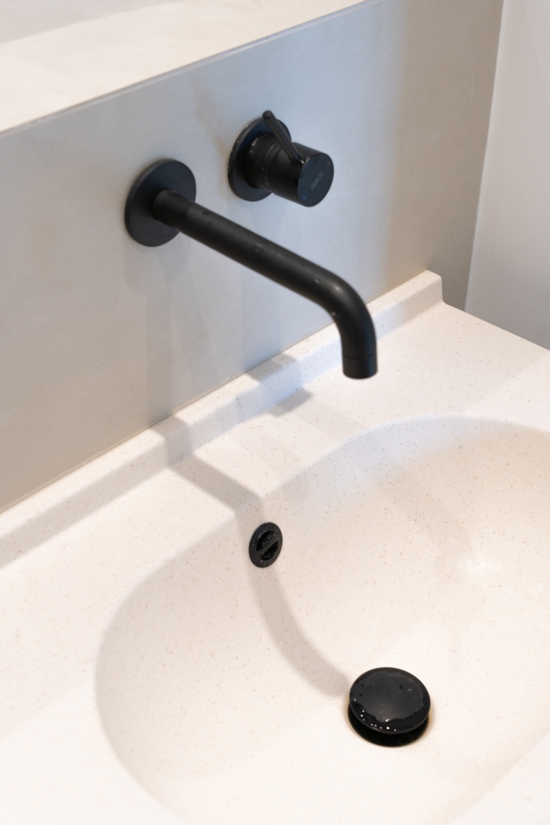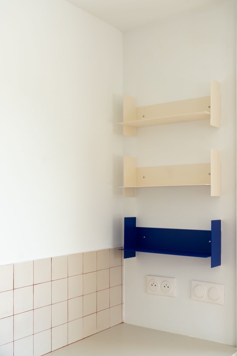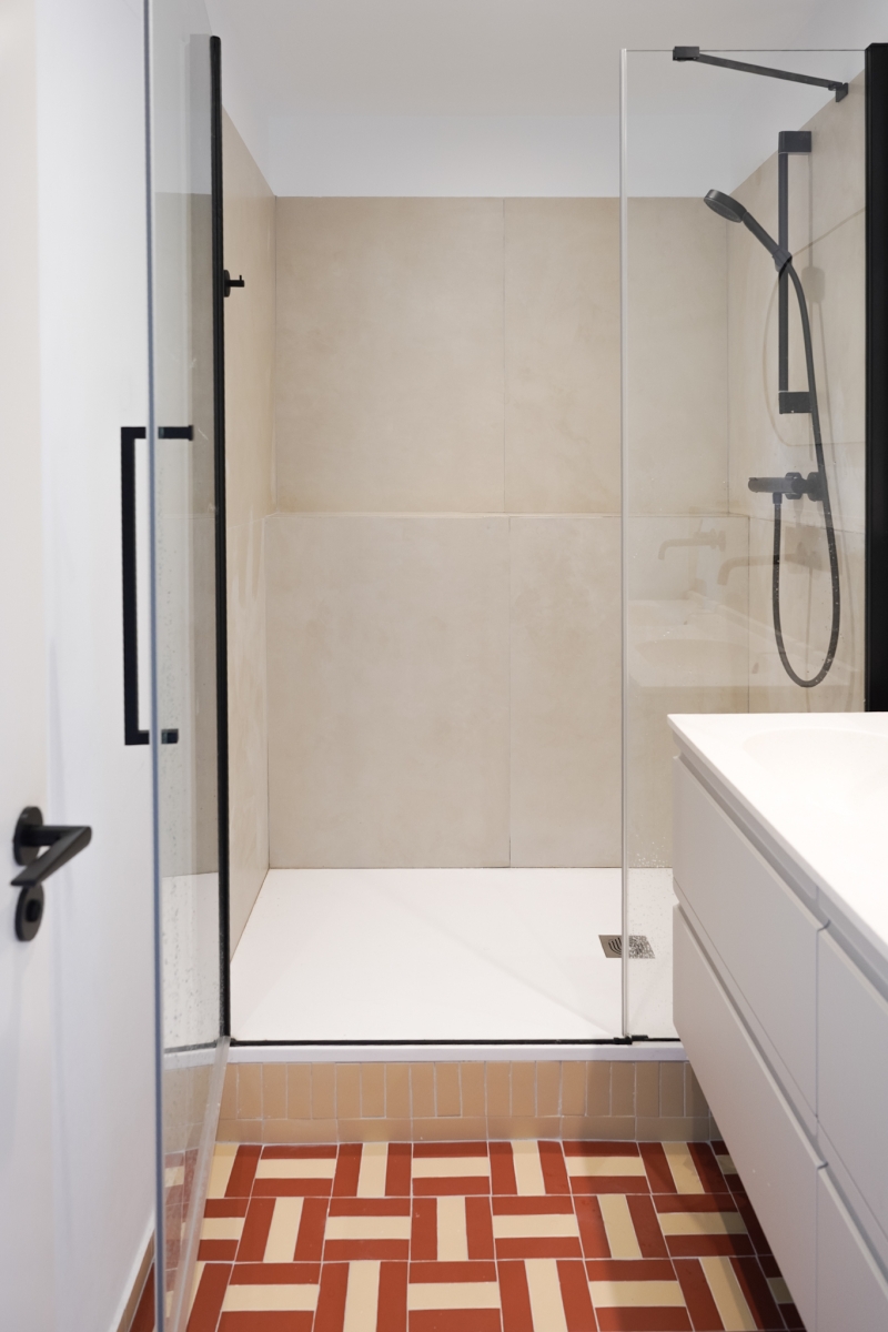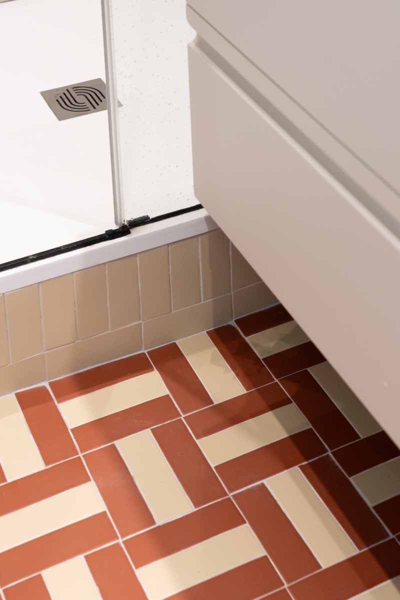 Dans les pièces d’eau, un calepinage graphique coloré vient rompre avec la sobriété des autres espaces.