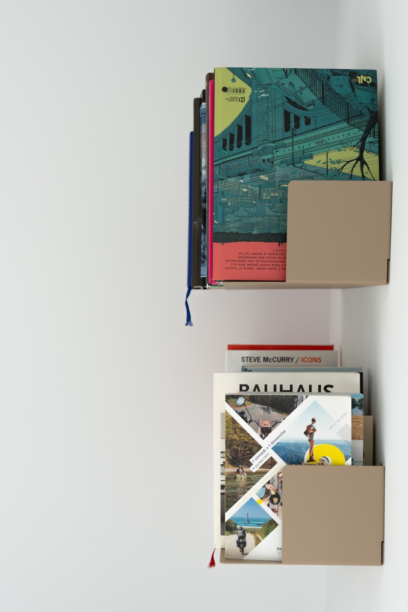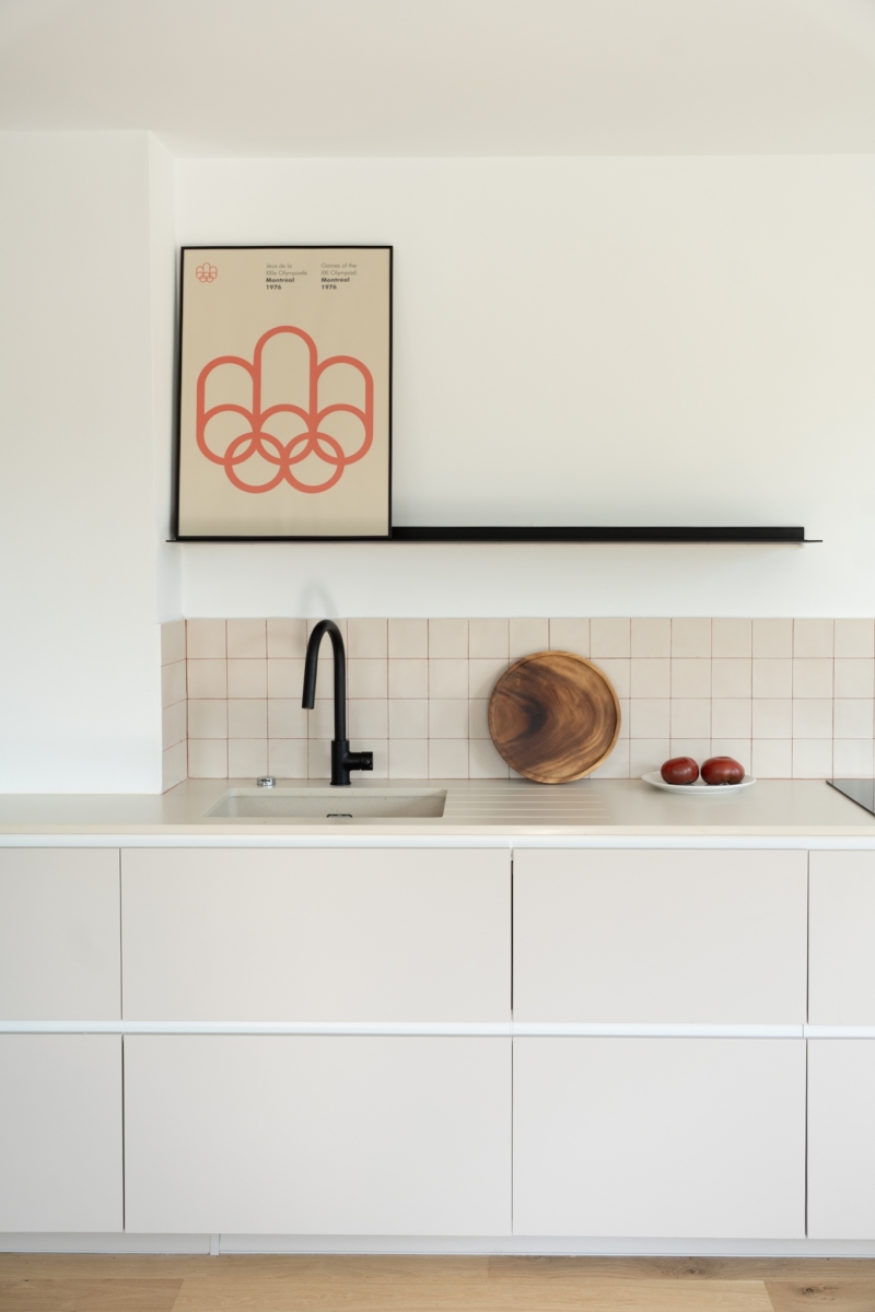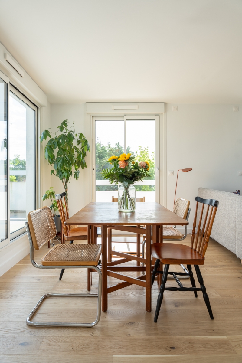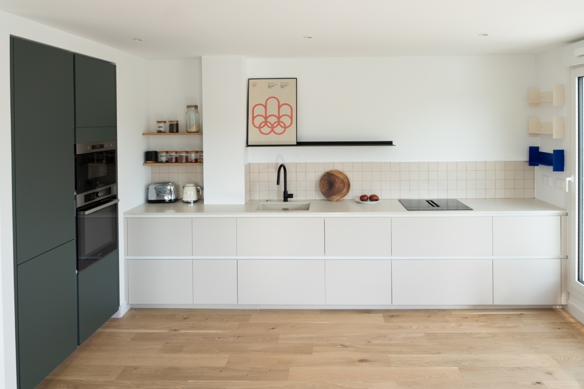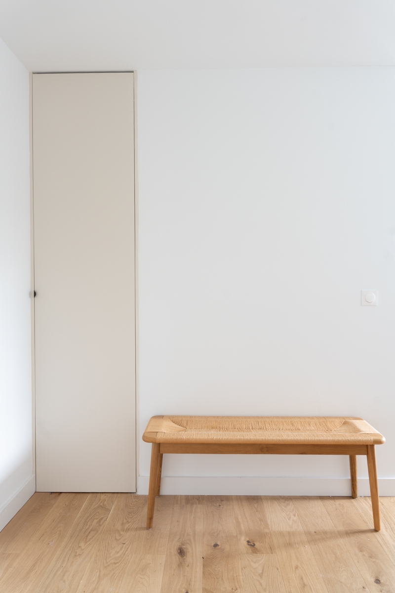 Le choix des matières et des tonalités s’est porté sur un vocabulaire volontairement discret : parquet en bois, murs et plafonds blancs, menuiseries sur mesure dans une teinte beige, apportant rythme et lisibilité aux volumes.
