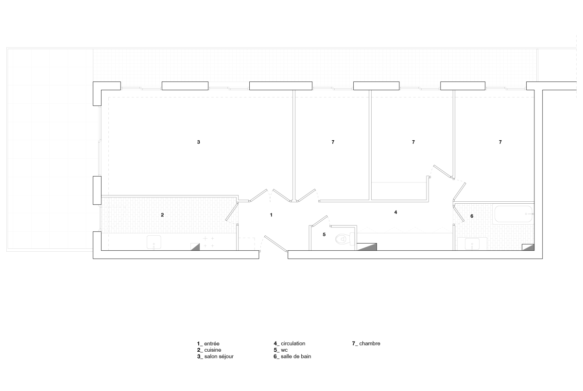 Le projet concerne la rénovation d’un appartement ancien dont les qualités initiales restaient peu mises en valeur. Si la trame d’origine a été partiellement préservée, l’ensemble a été repensé pour accueillir une grande pièce de vie traversante et lumineuse.