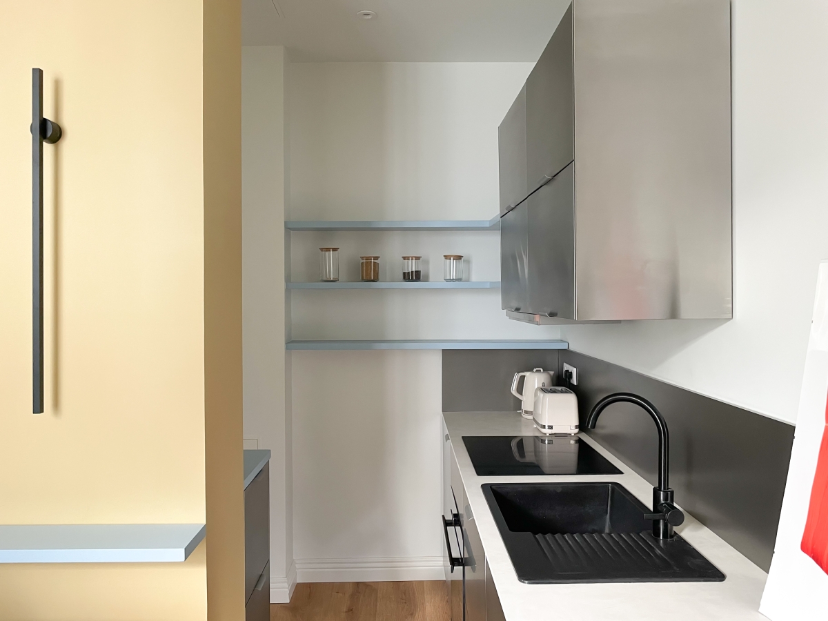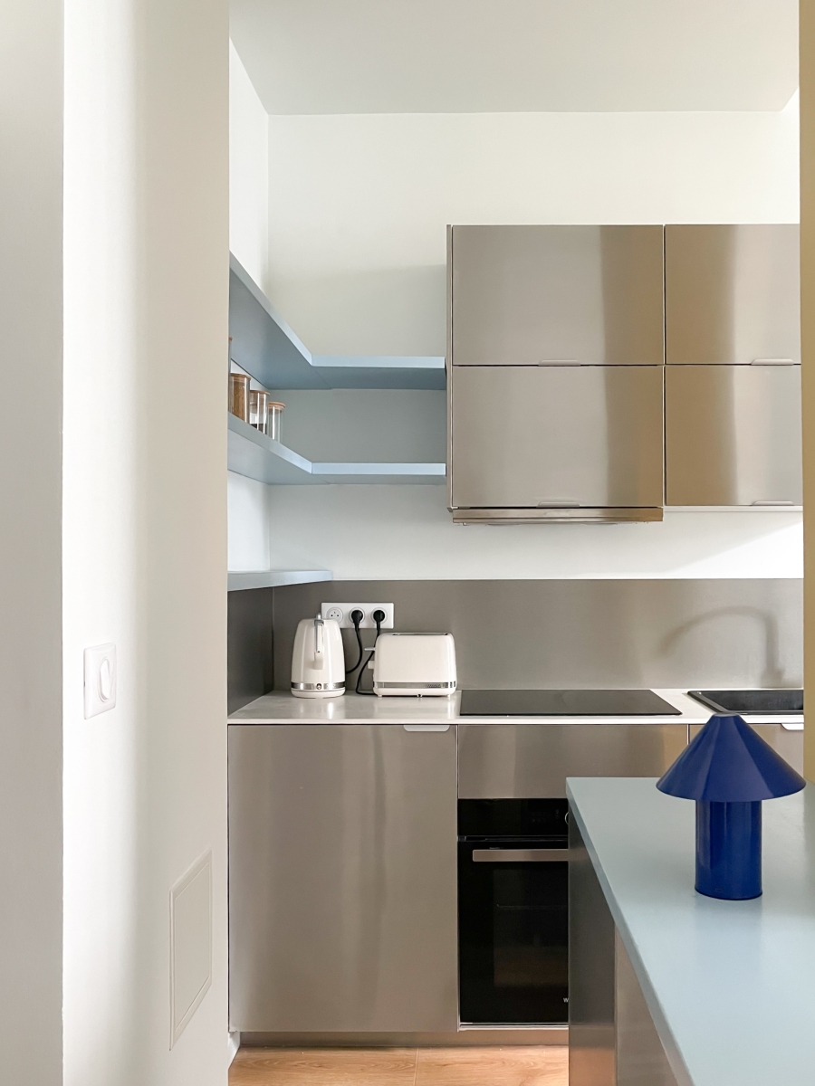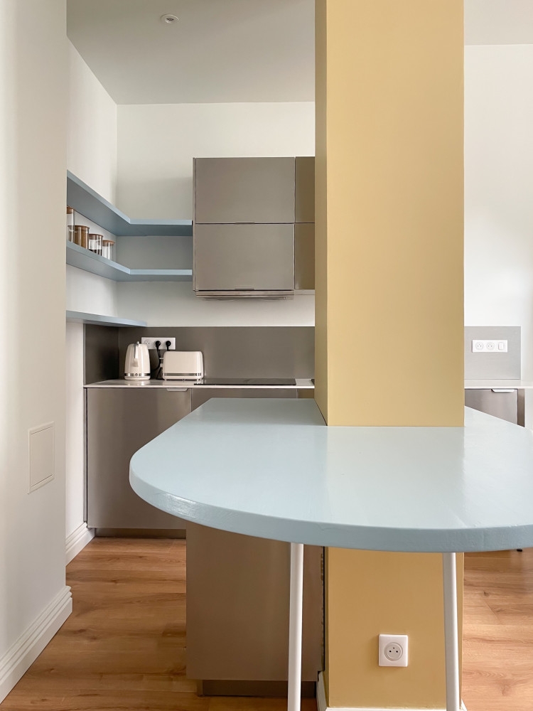 Ce studio, auparavant constitué d’une pièce principale avec mezzanine, d’une cuisine séparée et d’une salle de bain, a été entièrement repensé pour offrir un espace fluide et fonctionnel. Le défi principal était de s’adapter à une contrainte technique majeure : une gaine technique immuable, propre aux immeubles en copropriété. Plutôt que de chercher à la dissimuler, cette colonne technique a été transformée en un élément central du projet. Habillée d’un jaune vif, elle devient le pivot autour duquel s’organise la vie du studio. Autour de ce point structurant s’articule un meuble conçu sur mesure : une table bleu pastel qui, avec ses angles arrondis, accompagne une circulation fluide au sein de l’espace. En arrière-plan, les façades inox de la cuisine ajoutent une touche lumineuse, reflétant la lumière et amplifiant visuellement les volumes. Par ce jeu de couleurs et de matières, nous avons transformé une contrainte technique en un atout structurant, en créant un espace lumineux, fluide et accueillant.