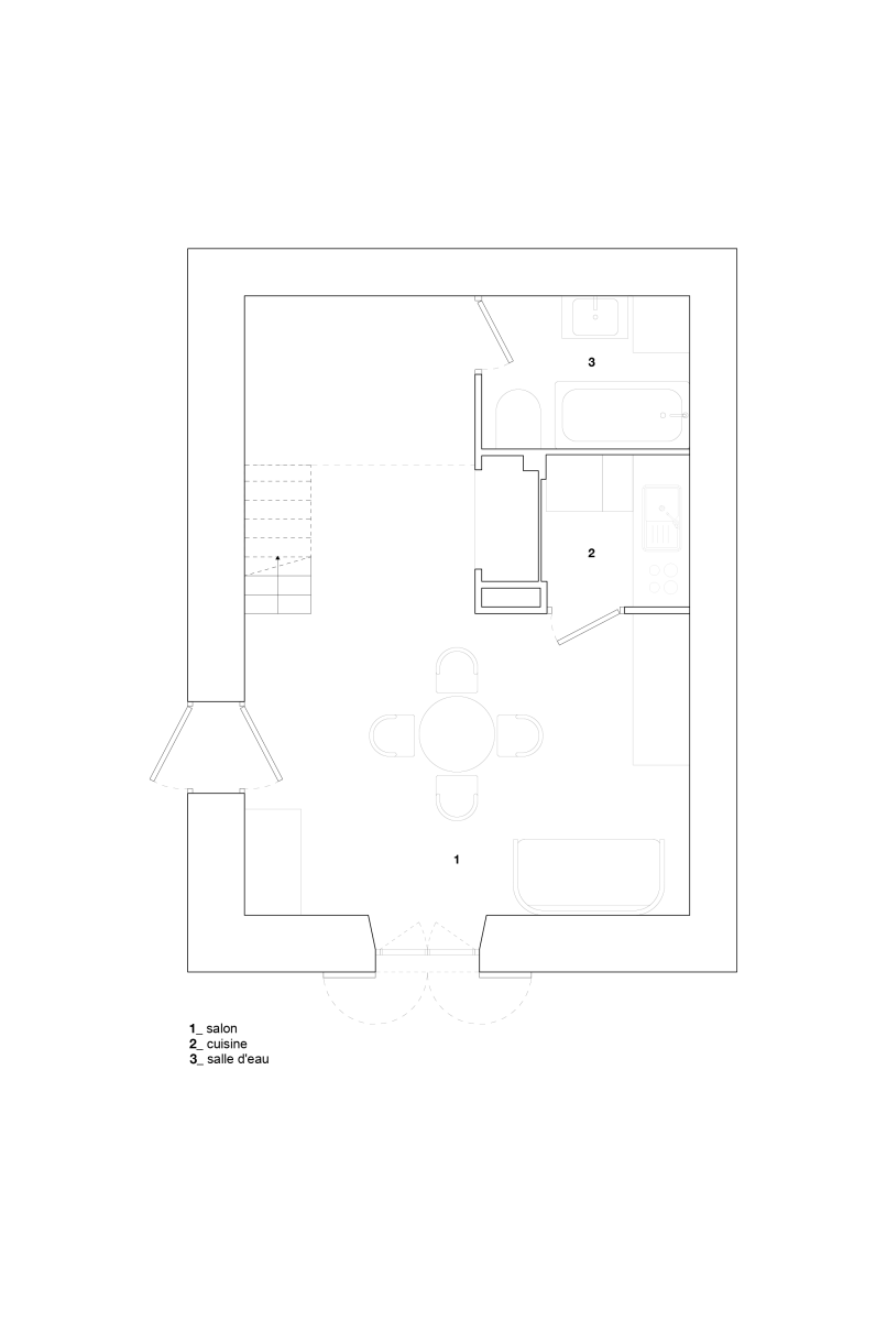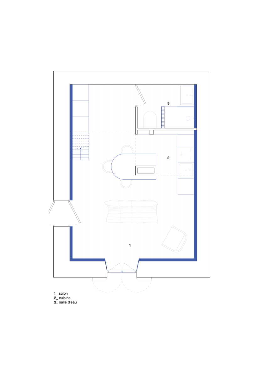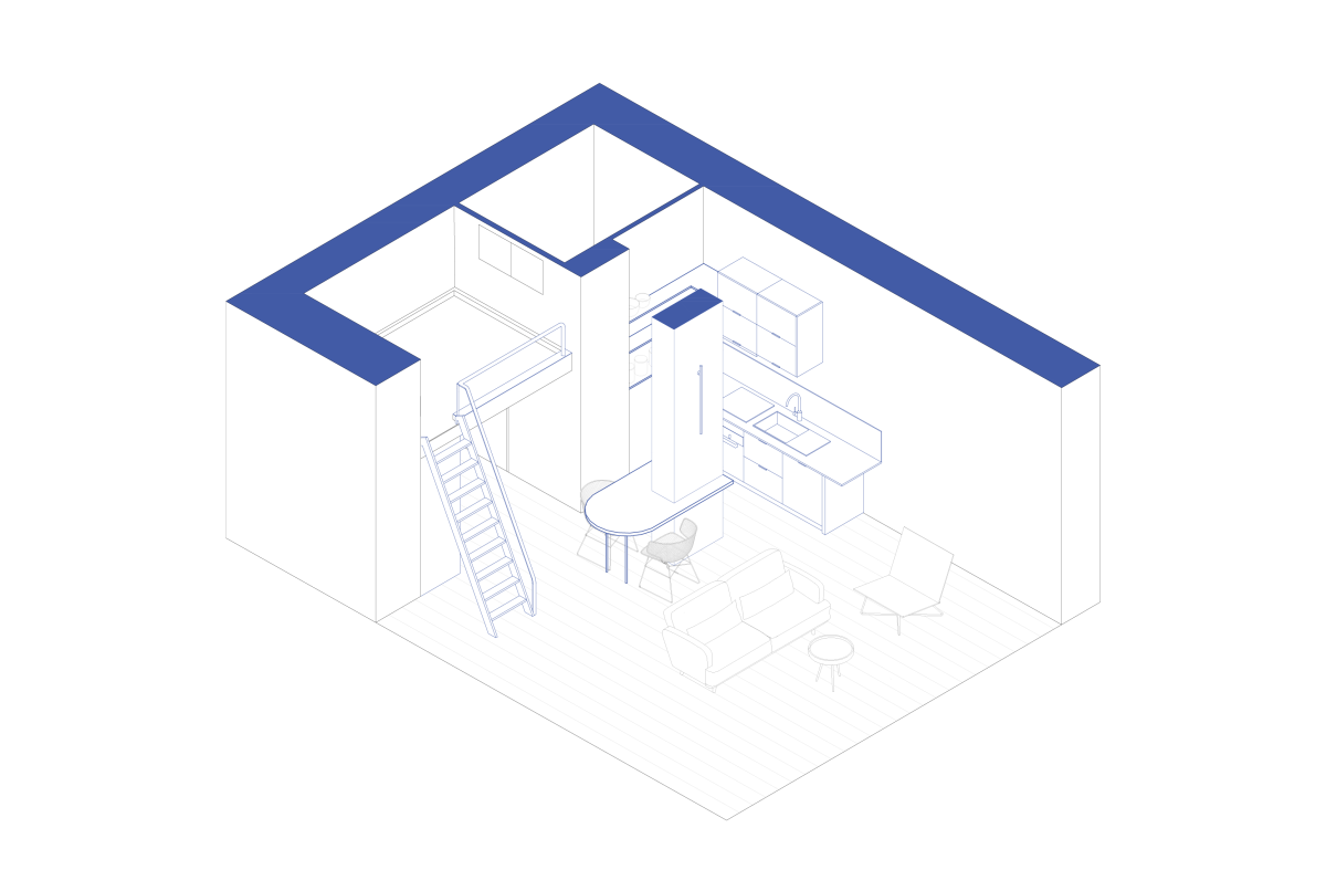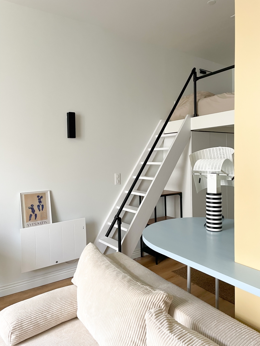 Ce studio, auparavant constitué d’une pièce principale avec mezzanine, d’une cuisine séparée et d’une salle de bain, a été entièrement repensé pour offrir un espace fluide et fonctionnel. Le défi principal était de s’adapter à une contrainte technique majeure : une gaine technique immuable, propre aux immeubles en copropriété. Plutôt que de chercher à la dissimuler, cette colonne technique a été transformée en un élément central du projet. Habillée d’un jaune vif, elle devient le pivot autour duquel s’organise la vie du studio. Autour de ce point structurant s’articule un meuble conçu sur mesure : une table bleu pastel qui, avec ses angles arrondis, accompagne une circulation fluide au sein de l’espace. En arrière-plan, les façades inox de la cuisine ajoutent une touche lumineuse, reflétant la lumière et amplifiant visuellement les volumes. Par ce jeu de couleurs et de matières, nous avons transformé une contrainte technique en un atout structurant, en créant un espace lumineux, fluide et accueillant.